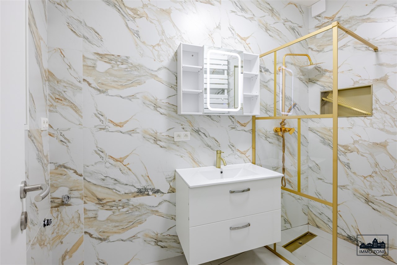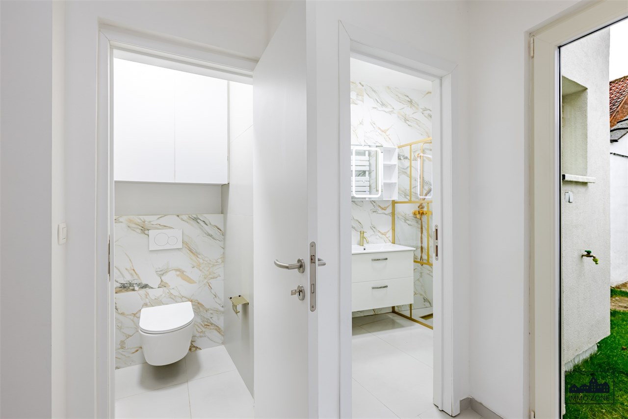 Achteraan bevinden zich een apart gastentoilet en een moderne badkamer met inloopdouche, stijlvol en onderhoudsvriendelijk afgewerkt. Vanuit de keuken heeft u toegang tot het gezellige tuintje.