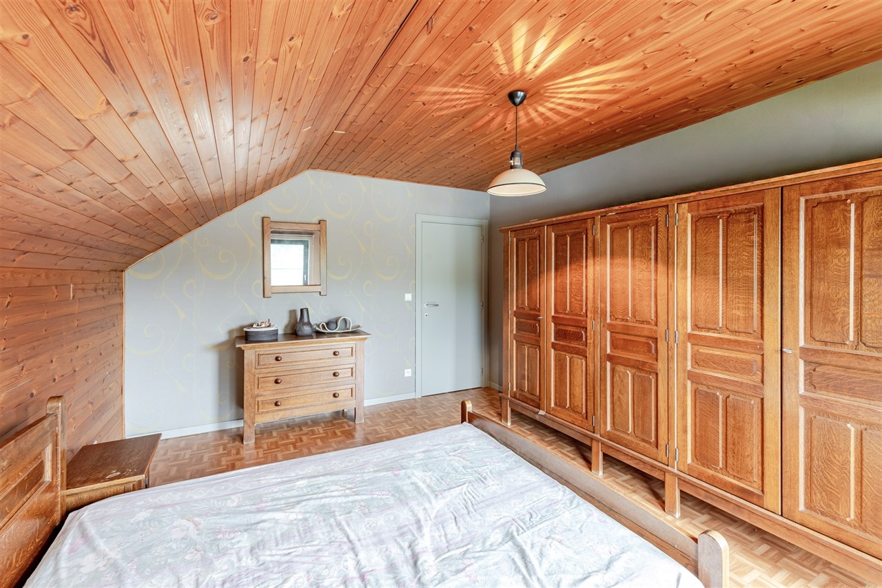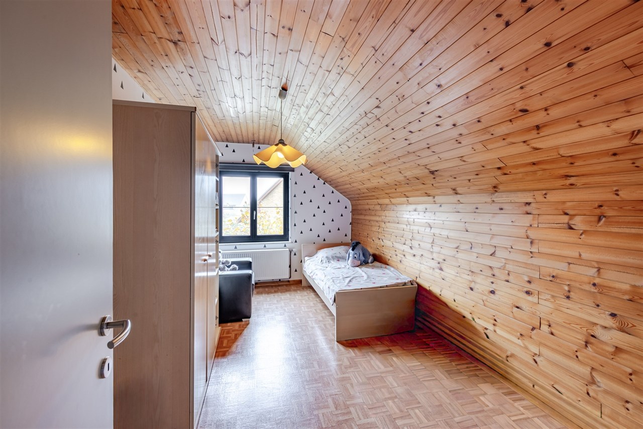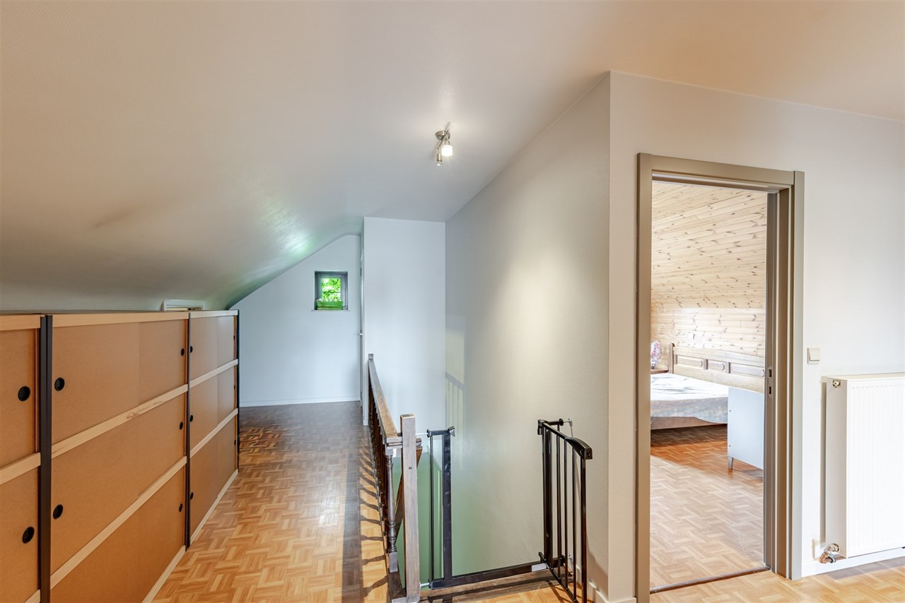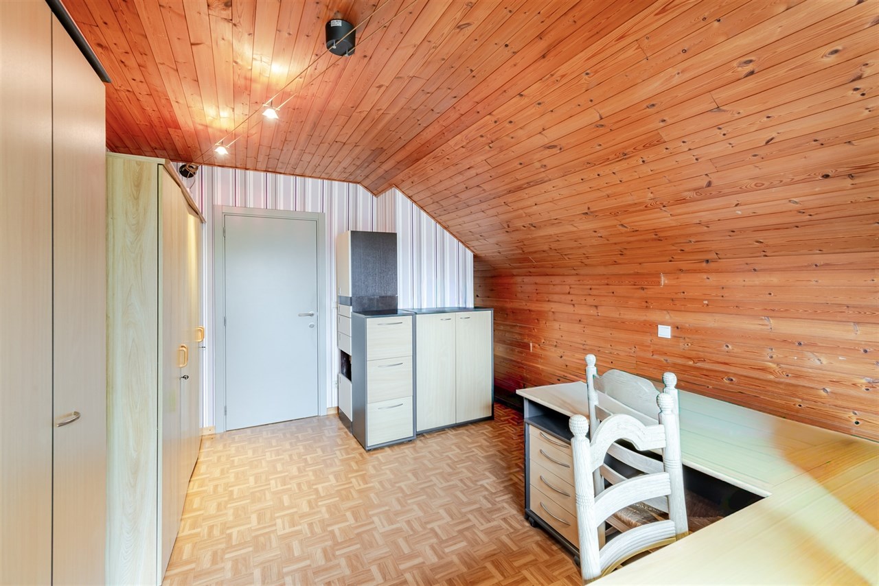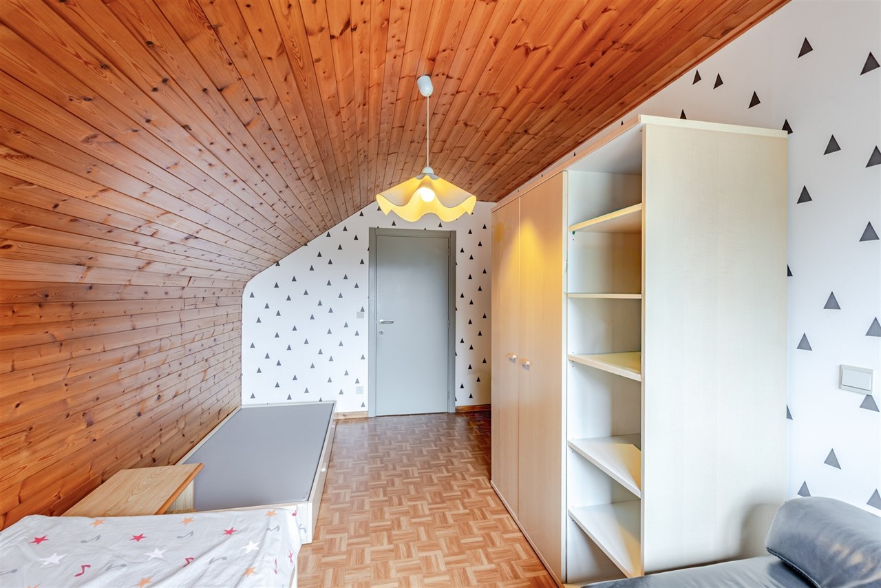 Indeling: inkomhal met toilet gevolgd door de ruime en lichtrijke leefruimte met zicht op de tuin. Verder vinden we de keuken die voorzien is van een vaatwasser, oven, microgolf, frigo en kookplaat. Aansluitend is een ruime berging/ wasplaats. Ook vinden we gelijkvloers al een eerste slaapkamer met ingebouwde kasten en de badkamer die voorzien is van een ligbad en douche. Op de eerste verdieping vinden we een nachthal met toilet en 3 ruime slaapkamers (14m², 16,5m² en 17m²). Daarnaast is er ook een zolder die extra bergruimte biedt. De woning beschikt bovendien over een inpandige garage met elektrische poort.