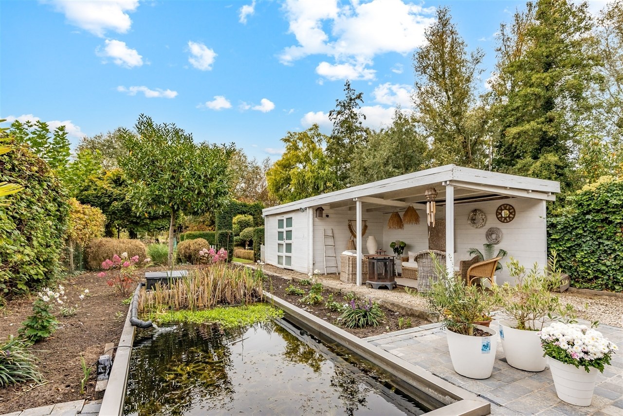 Een grote troef is het mooie terras waarvan er zicht is op de prachtig aangelegde tuin, vijver, extra tuinbergingen en het uniek uitzicht over de velden, ideaal om te ontspannen en te genieten van de rust. De tuin is rondom omheind en voorzien van een hek, en aan de voorzijde biedt het perceel toegang tot de bijzonder ruime oprit waar meerdere auto’s plaats kunnen vinden.