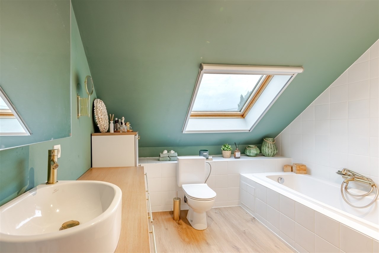 De indeling is als volgt: inkomhal met gastentoilet, gevolgd door de ruime en lichtrijke leefruimte en volledig ingerichte keuken die voorzien is van alle comfort. Aansluitend vinden we een praktische bergruimte en een ruime garage met automatische poort. Op de eerste verdieping vinden we 3 ruime slaapkamers, waarvan de master bedroom een eigen aansluitende dressing heeft, en een badkamer die voorzien is van een meubel, ligbad, douche en tweede toilet.