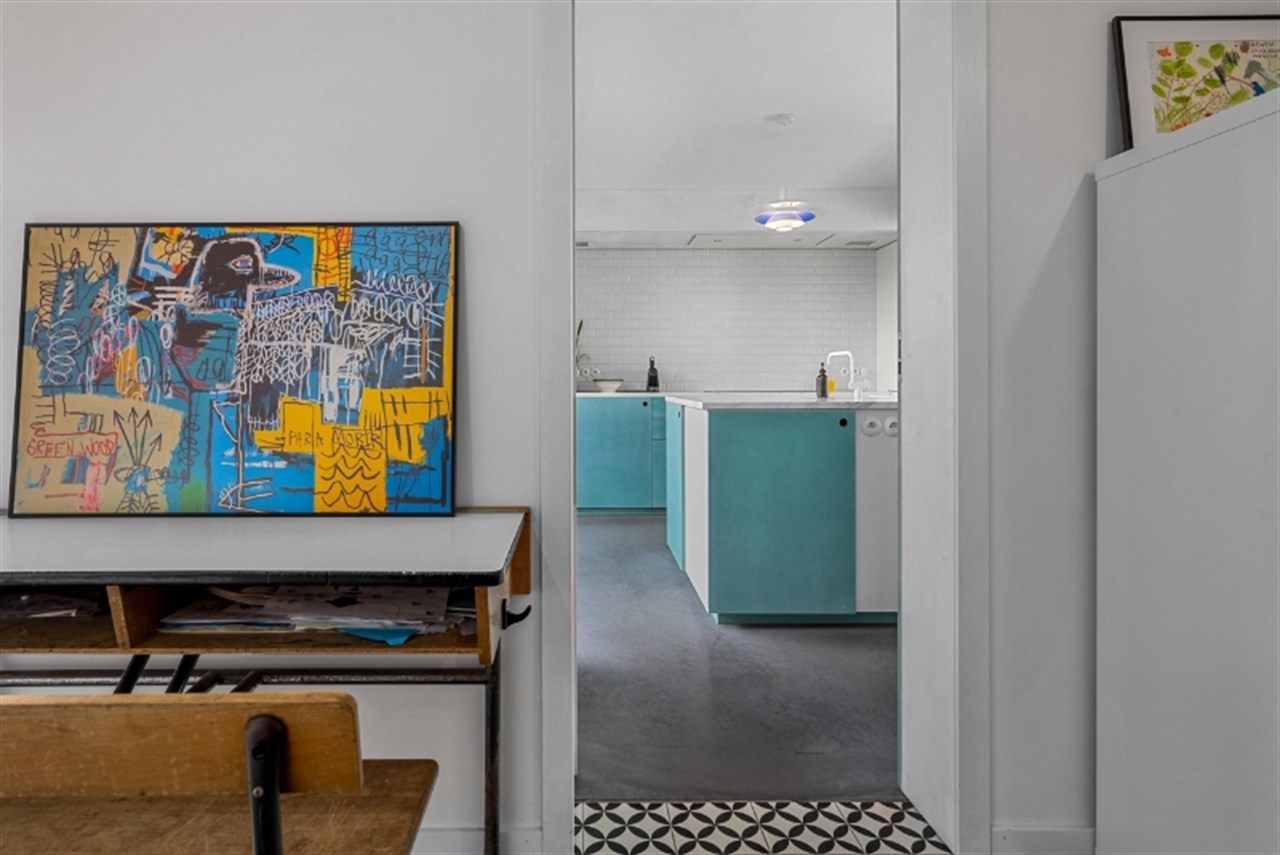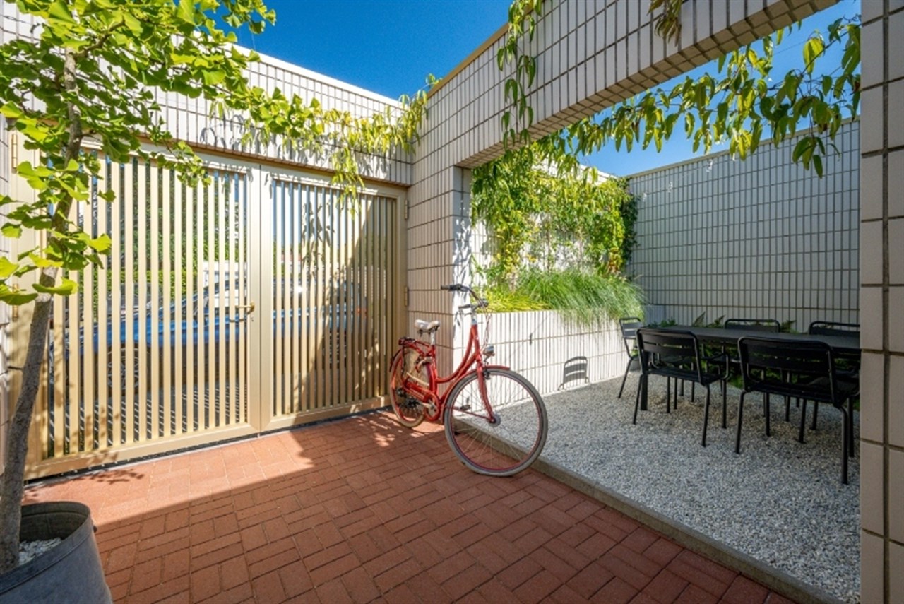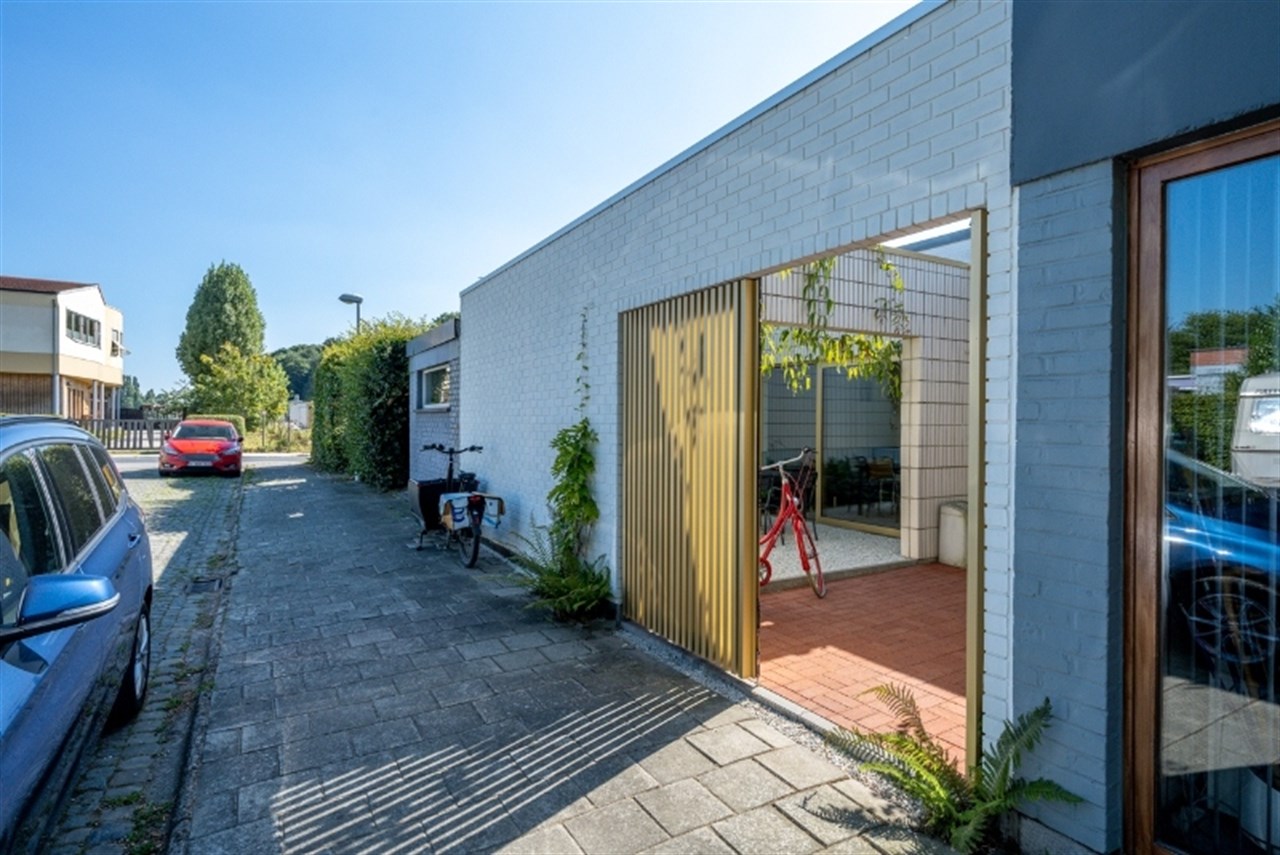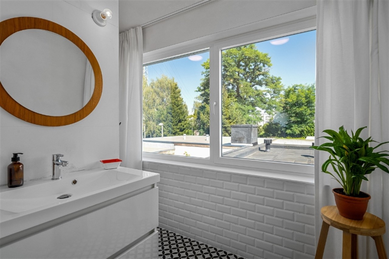 Deze rustig gelegen woning werd in 2016 volledig en smaakvol gerenoveerd met veel aandacht voor detail en wooncomfort. Bij het betreden van de woning komt men in de inkomhal met apart gastentoilet. De ingerichte keuken met eiland en eetplaats geniet een aangename lichtinval en biedt uitzicht op de voortuin en de charmante Romeinse patio die centraal in de woning werd geïntegreerd. Achteraan bevindt zich de gezellige leefruimte met zicht op het terras. Keuken en leefruimte worden verbonden door een lange, lichtrijke gang met ingebouwde kasten en een praktische ingewerkte bureauruimte. Verder beschikt de woning over een ruime berging/wasplaats en een bijkomende bergruimte. Op de eerste verdieping bevinden zich twee ruime slaapkamers, een derde kleinere kamer en een vernieuwde badkamer uitgerust met inloopdouche, badkamermeubel en een apart toilet.