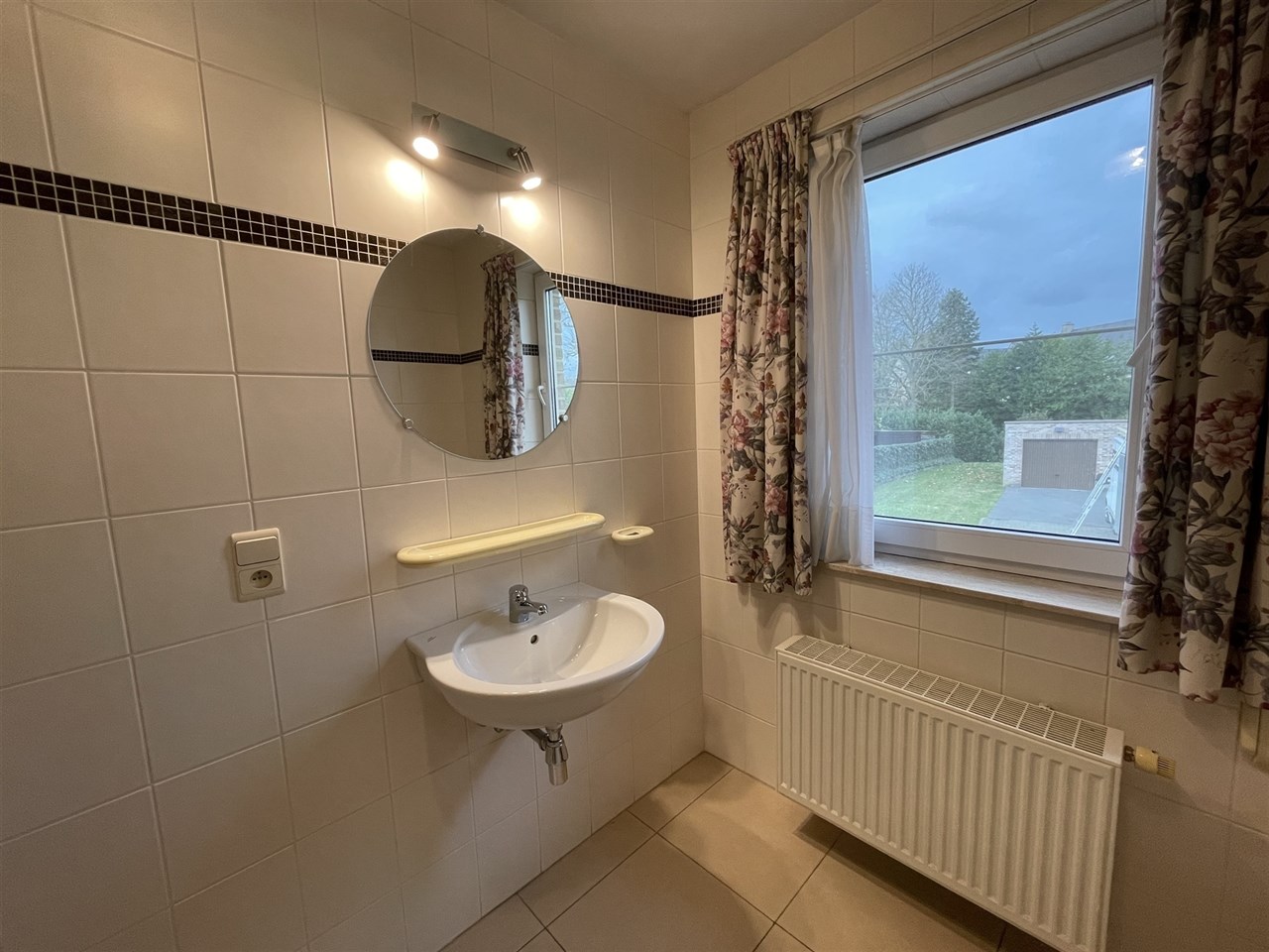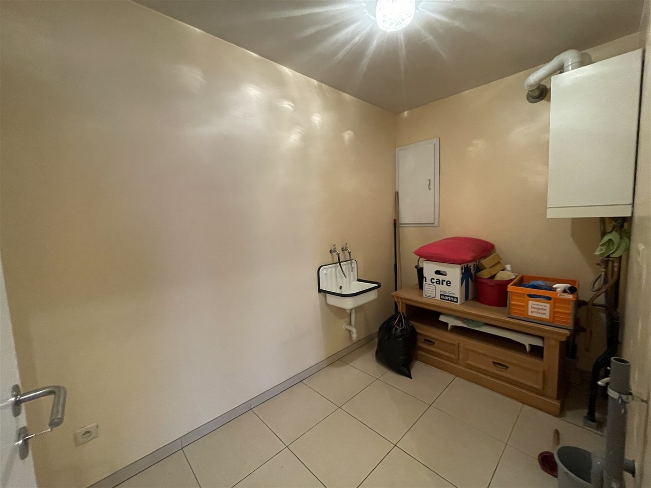 Lichtrijke living van 32 m², ruime ingerichte keuken (18 m²) met eetgelegenheid en toestellen (kookplaat, oven, dampkap, frigo en vaatwasser).