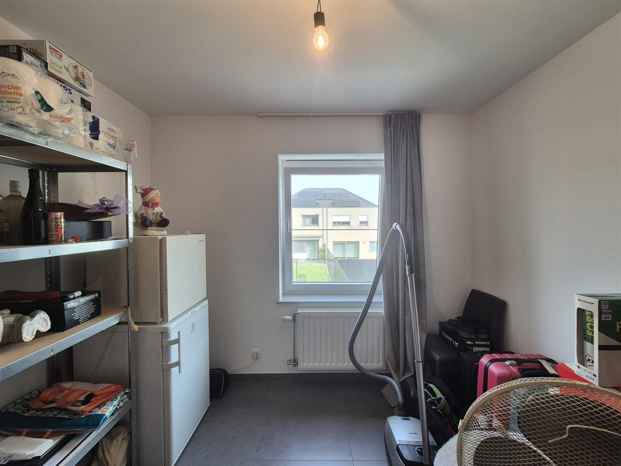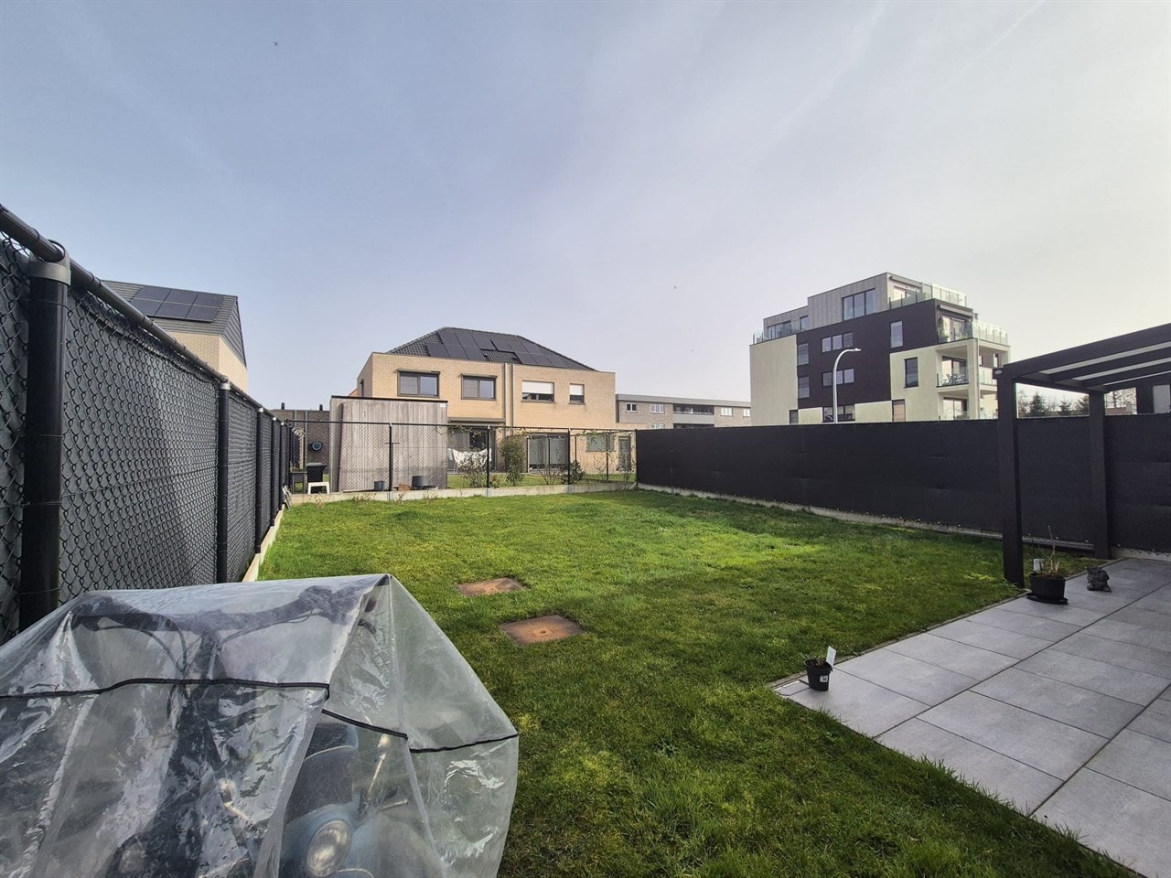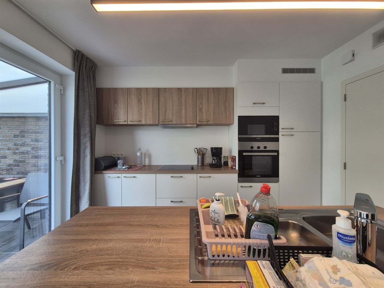 Inkomhal, hangtoilet met lavabo, aangename ruime lichtrijke living met open ingerichte keuken uitgerust met ceramische kookplaat, dampkap, microgolf, warme luchtoven, vaatwasser en frigo.