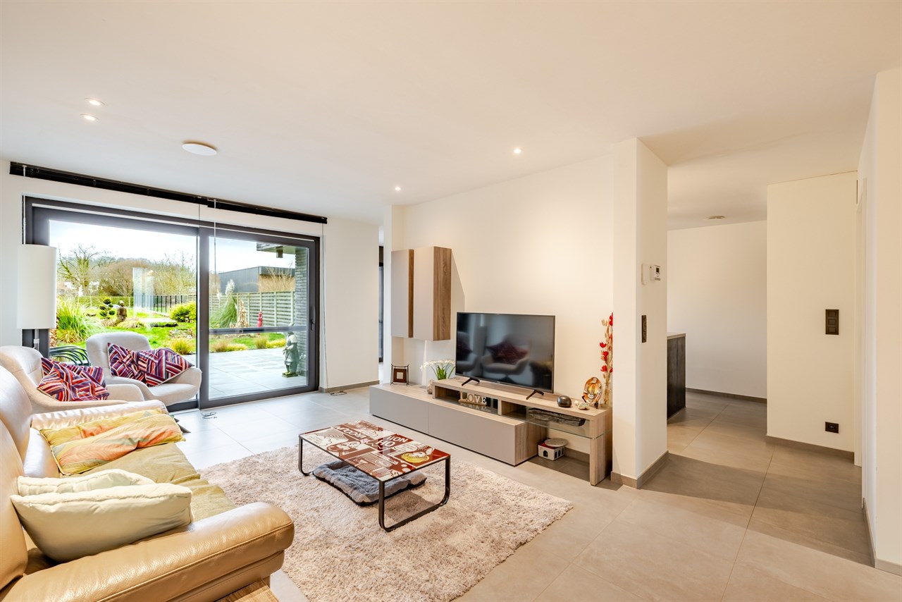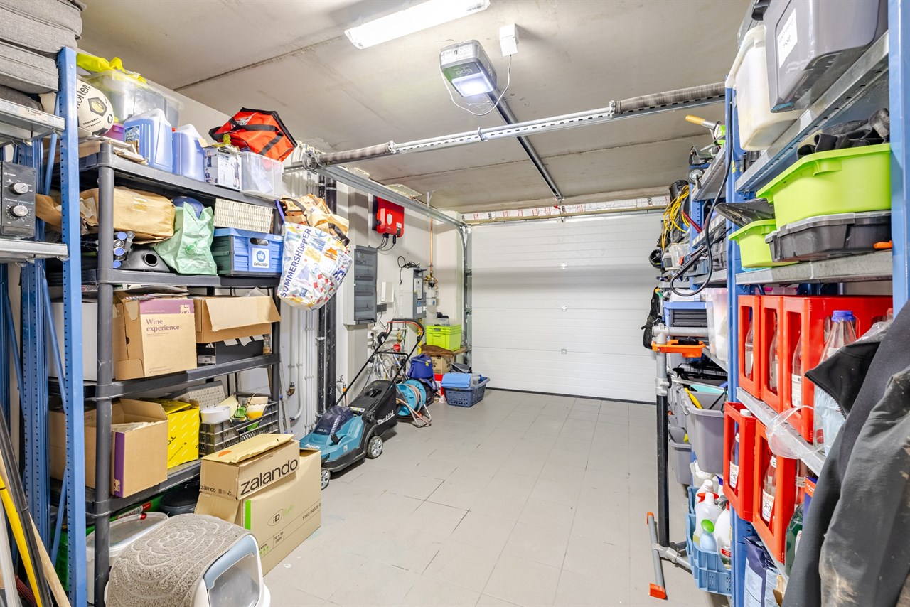 Via de inkomhal betreedt u het gelijkvloers met een ruime en lichtrijke leefruimte met zicht op de tuin en een moderne leefkeuken met eetplaats. Verder bevinden zich hier een praktische garage en een gastentoilet.