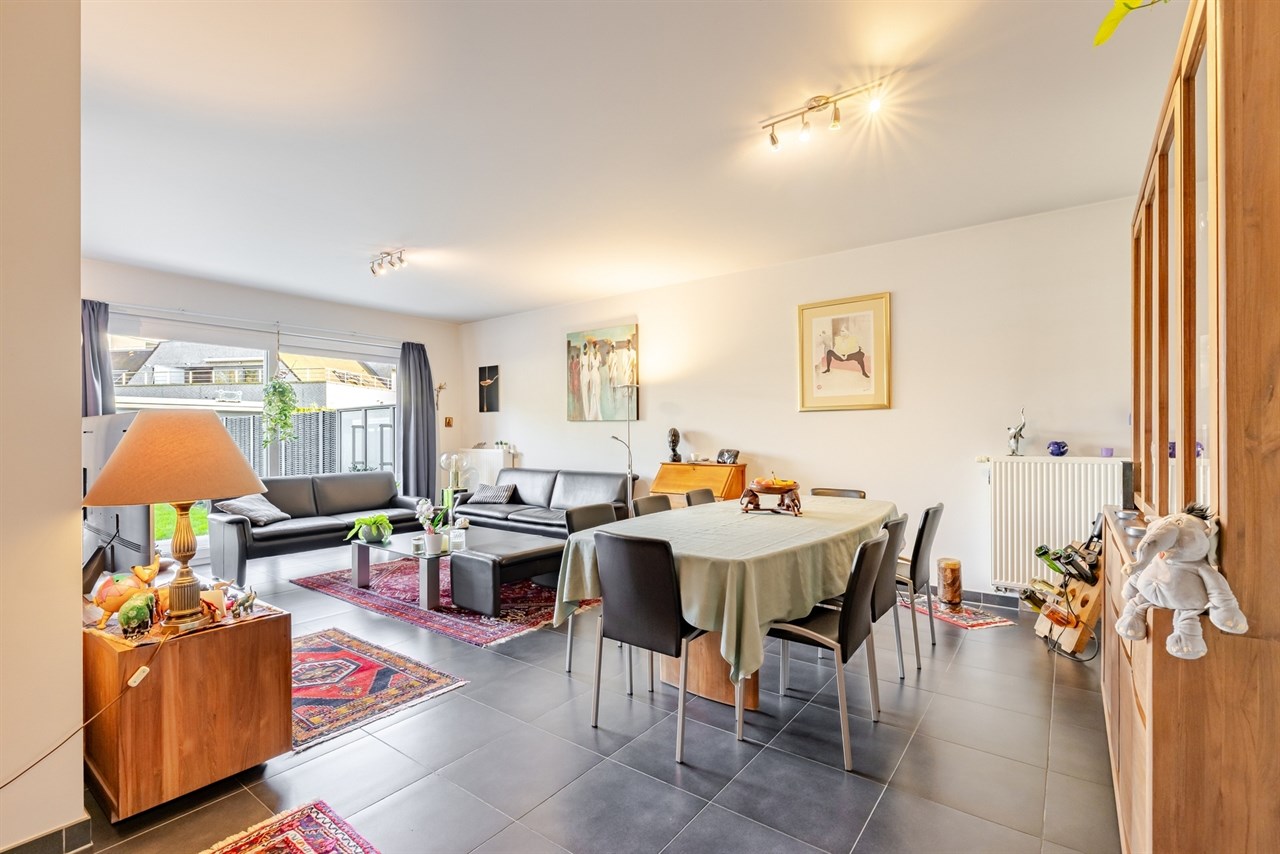 Op het gelijkvloers bevinden zich de inkomhal, de ontzettend ruime en lichtrijke woonkamer, met aansluiting naar de tuin, de ingerichte keuken met aansluitend de berging, de badkamer met ligbad en douche, een apart toilet, en 2 slaapkamers.