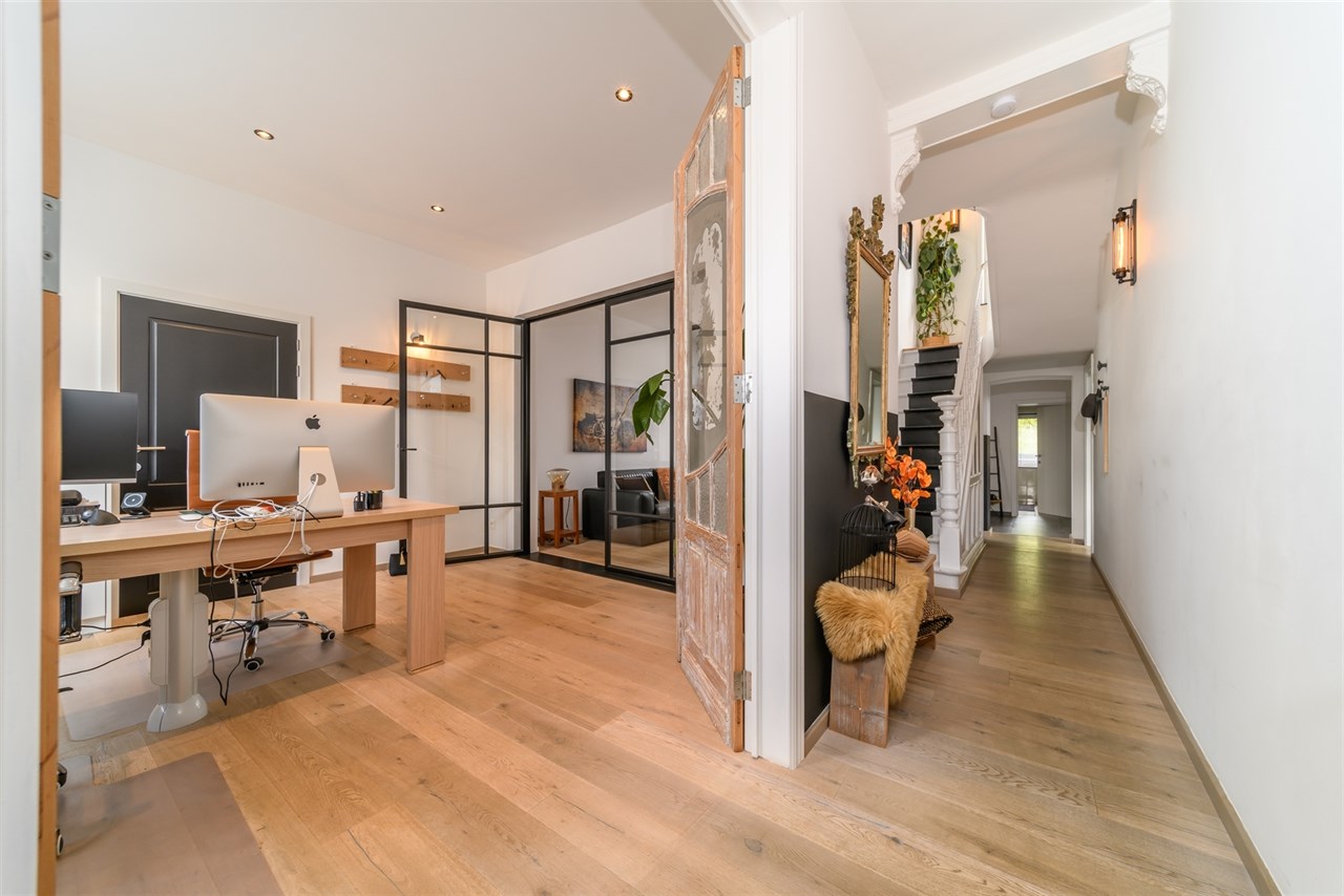 Via de inkomhal betreedt u de woning, die toegang biedt tot meerdere bureauruimtes, een gezellige leefruimte en een volledig geïnstalleerde keuken met aansluitende praktische bergingen. Op het gelijkvloers bevinden zich bovendien een badkamer en een ruime garage, waardoor deze verdieping zich perfect leent voor een vrij beroep, praktijkruimte of een comfortabele thuiswerkplek.