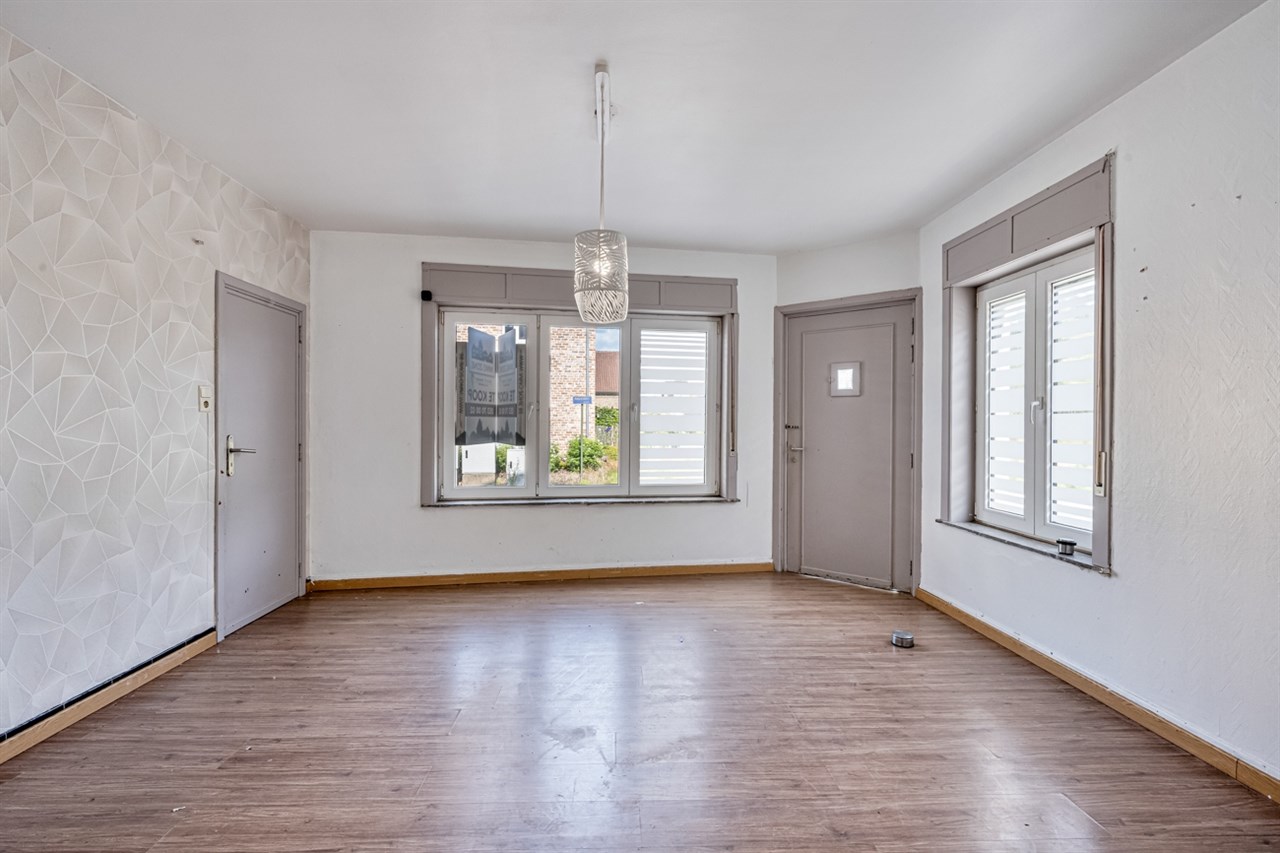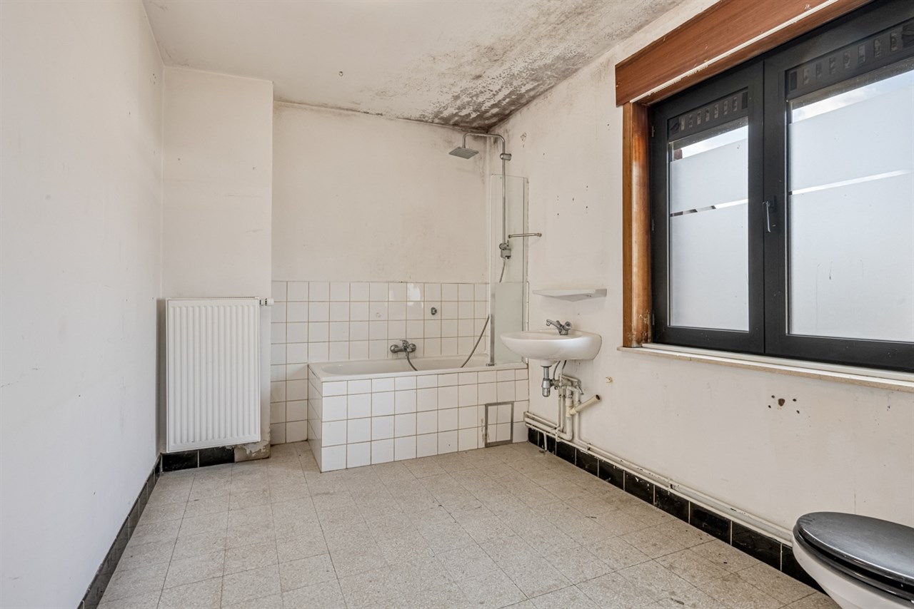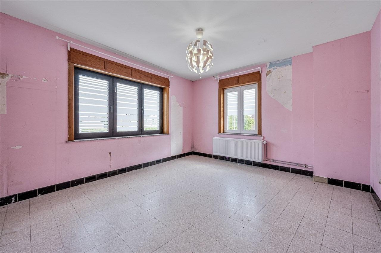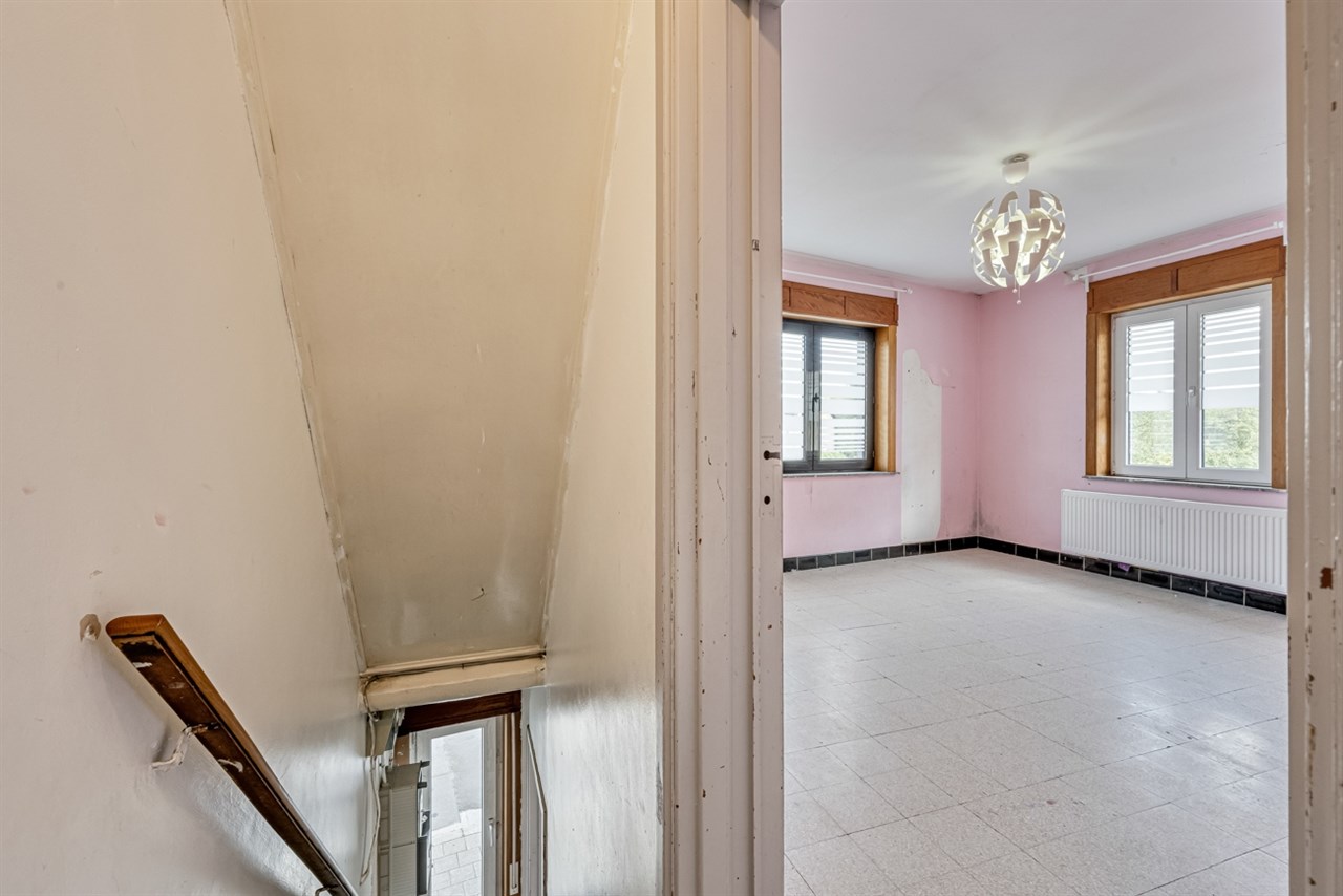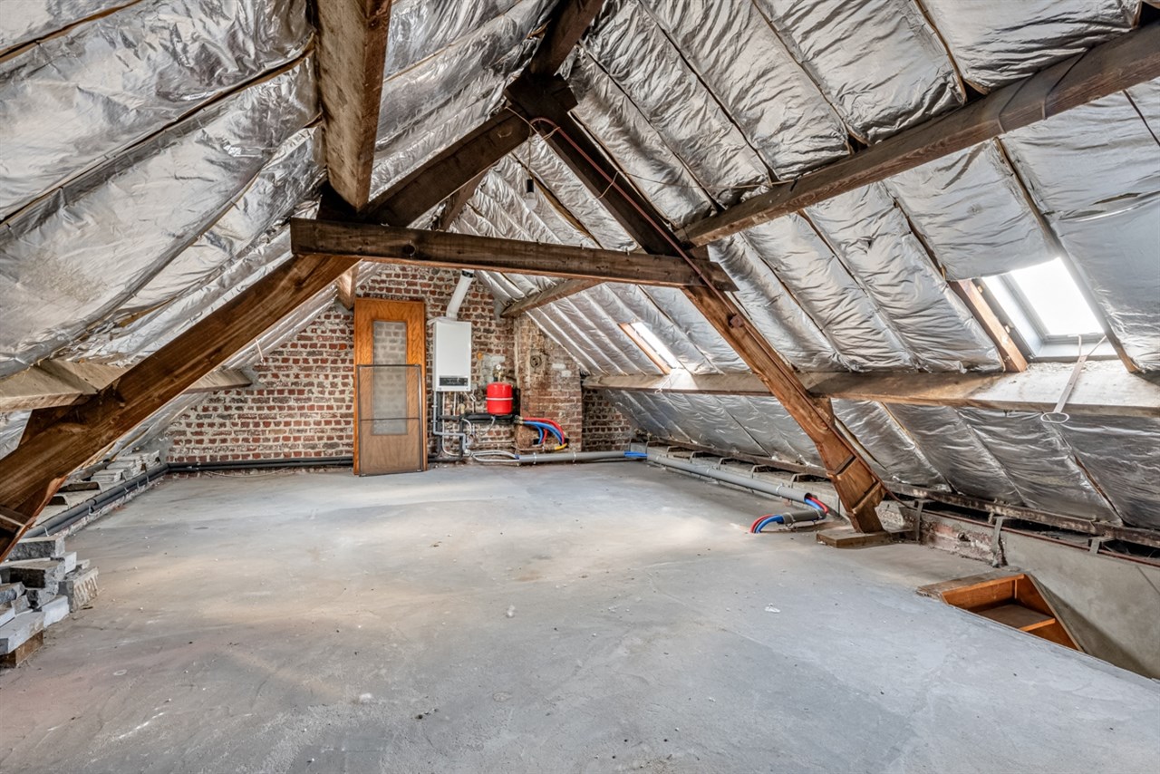 Op de verdieping bevinden zich twee slaapkamers. De ruime zolder biedt nog tal van mogelijkheden voor uitbreiding. Het dak vraagt renovatie, maar de woning is al voorzien van PVC-ramen met dubbel glas en centrale verwarming op aardgas, wat een solide basis vormt voor verdere modernisering.