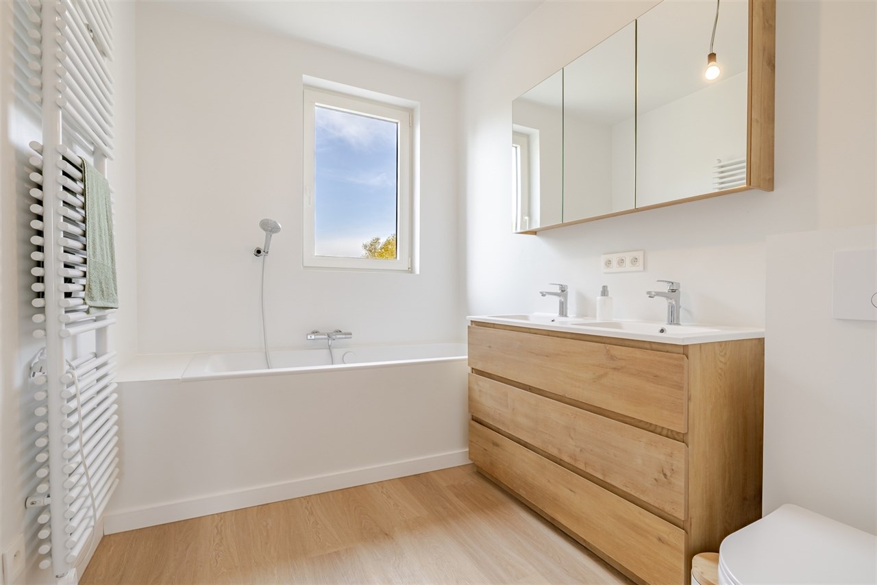 Op de eerste verdieping is er de prachtig gerenoveerde badkamer, met ligbad, lavabomeubel en toilet, 2 slaapkamers en nog een kleine badkamer met douche.