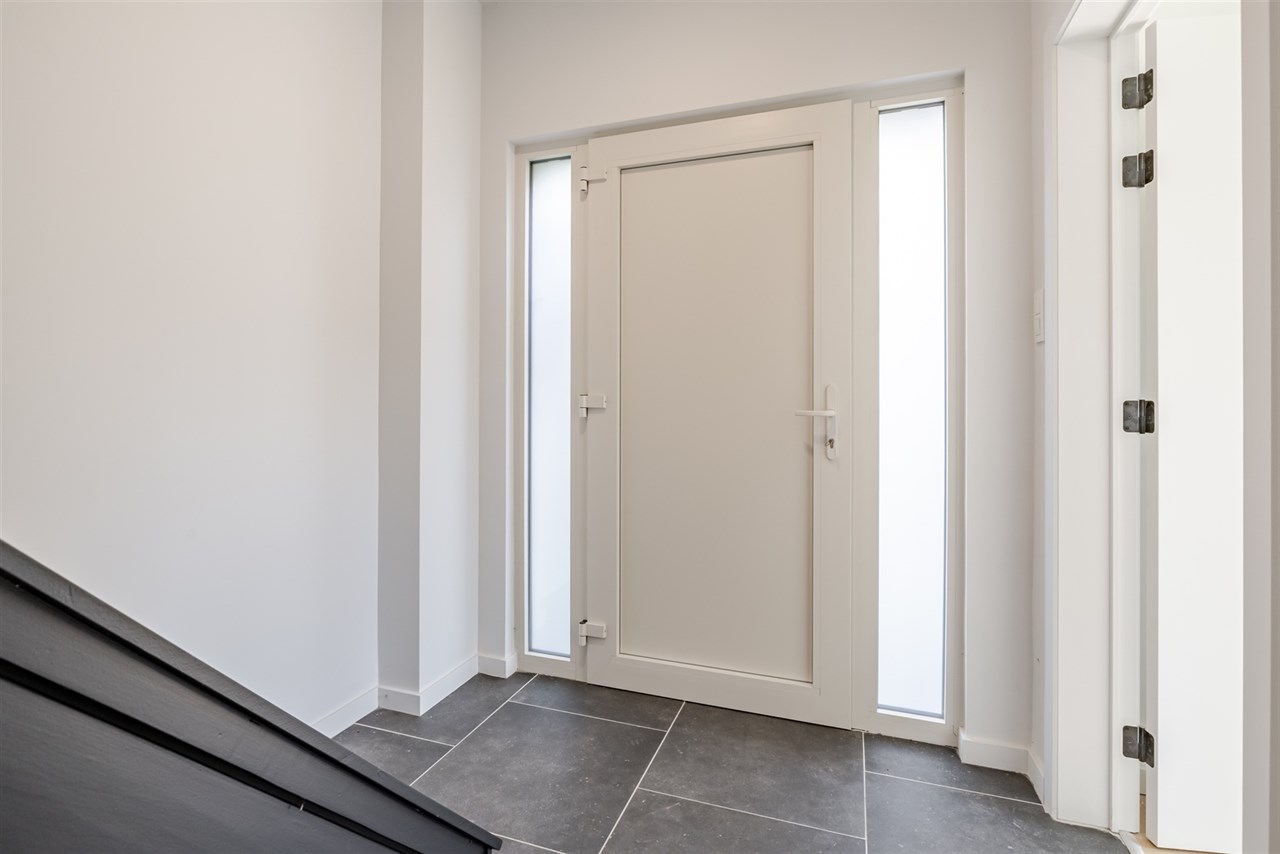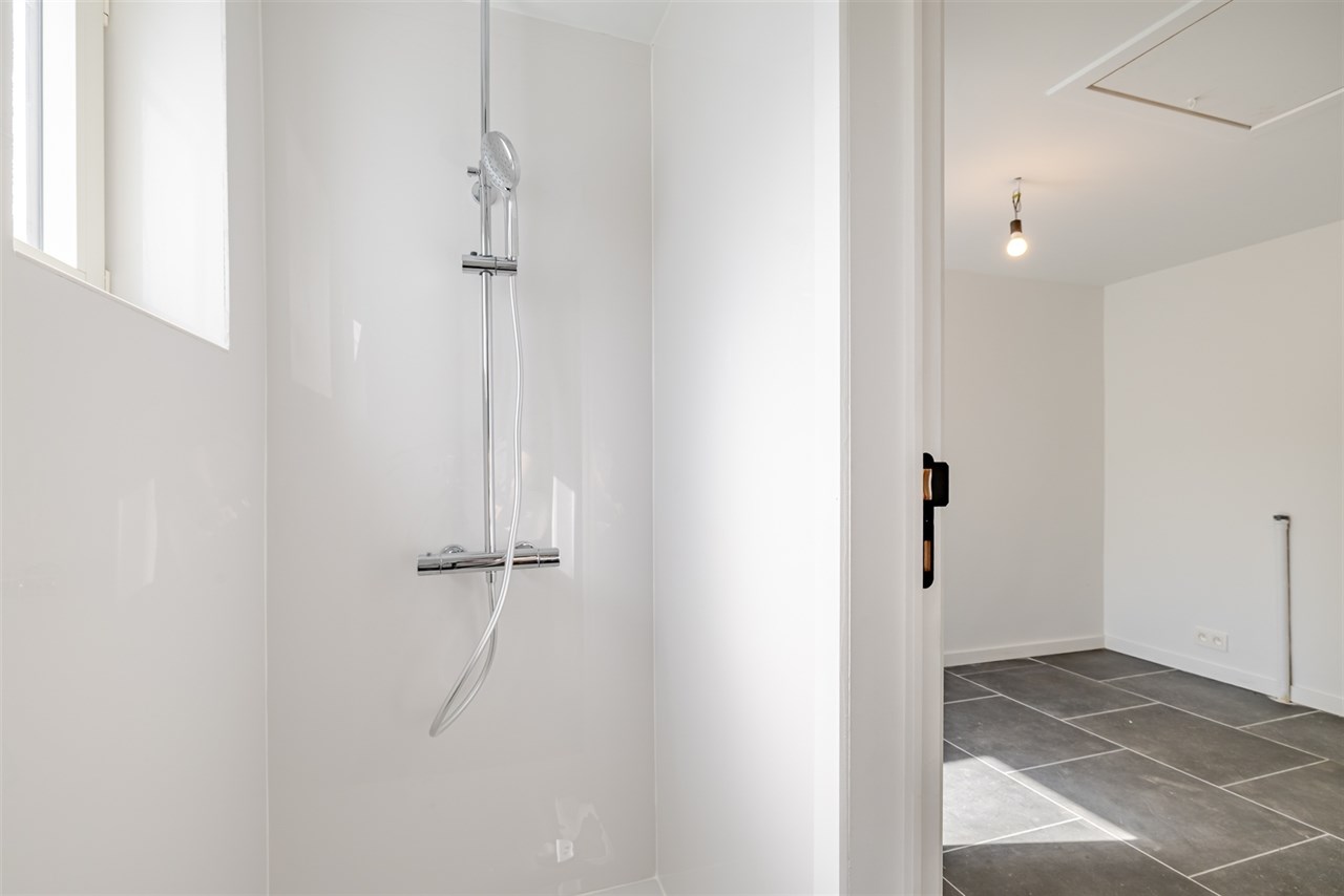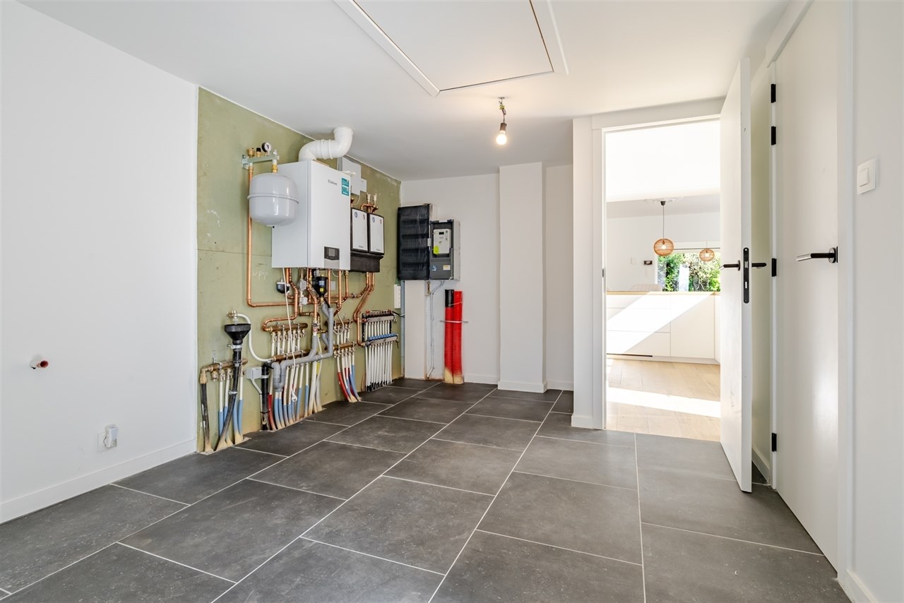 De woning beschikt op het gelijkvloers over een inkomhal met apart toilet, een ruime en ontzettend lichtrijke leefruimte en een volledig ingerichte open keuken. Er is nog een bergruimte, technische ruimte, met een tweede toilet en douche.