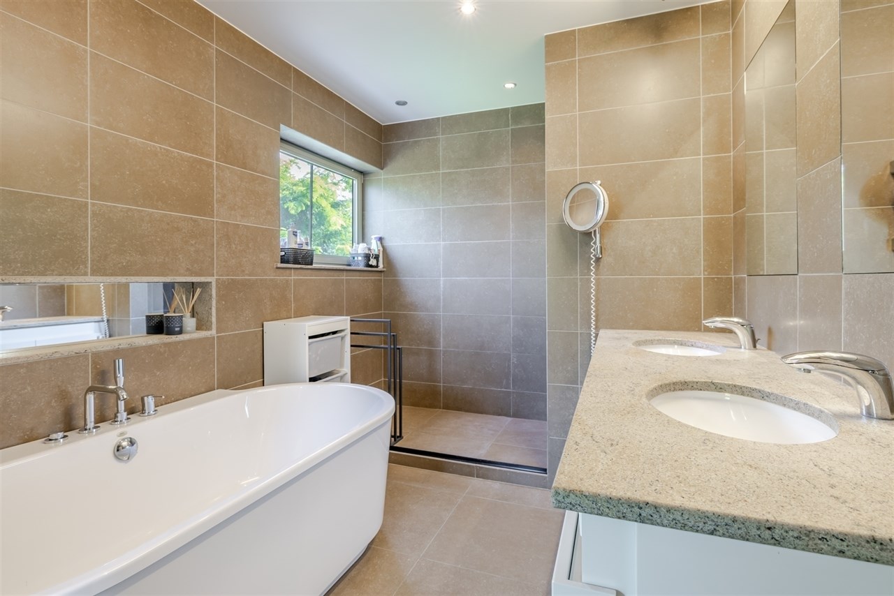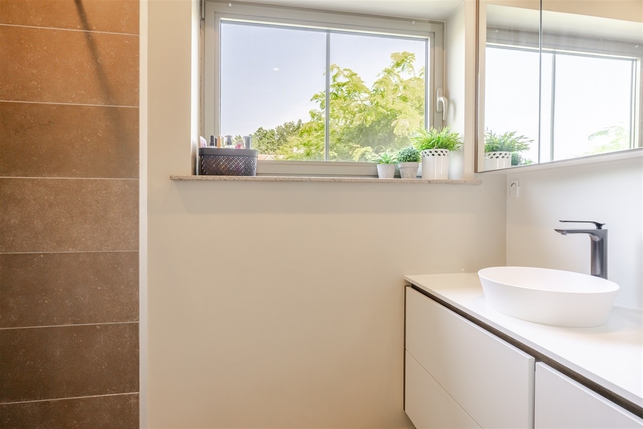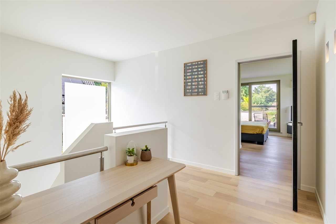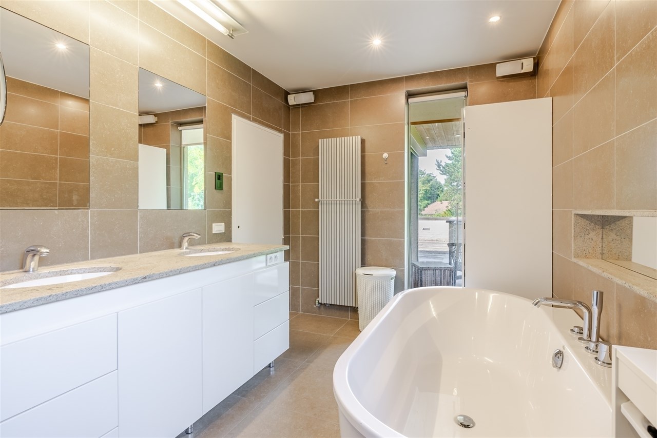 Op de eerste verdieping zijn er 3 slaapkamers. De masterbedroom beschikt over een dressing en aansluitend een dakterras. De badkamer omvat een ligbad, inloopdouche en dubbele wastafel. Er is ook nog een was- en doucheruimte en een apart toilet.