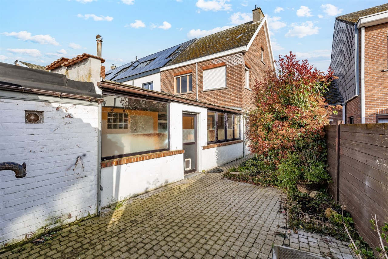 De woning verwelkomt je via de inkomhal, die toegang geeft tot de droge kelder en verder leidt naar de gezellige leefruimte. Aansluitend bevindt zich de ingerichte keuken met veranda, gevolgd door een apart toilet en een badkamer uitgerust met lavabomeubel en hoekligbad. Achteraan geniet je van een charmant stadstuintje met aanpalende stalling en regenwaterput. Extra praktisch is de zijtoegang naast de woning, ideaal om fietsen of ander materiaal rechtstreeks naar achter te brengen zonder door de woning te moeten gaan.