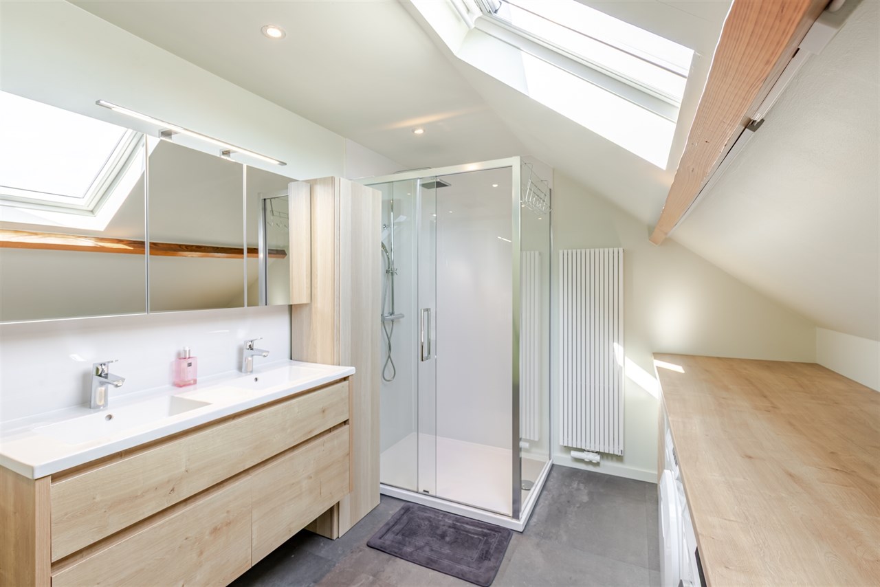 Indeling: Inkomhal, ruime leefruimte met aansluitend de lichtrijke keuken die voorzien is van een ingebouwde frigo, oven, inductie kookplaat en vaatwasser. Verder vinden we een berging en eerste toilet. Op de eerste verdieping vinden we 2 aangename slaapkamers. Op de tweede verdieping is een ruimte die kan gebruikt worden als derde slaapkamer, verder vinden we op deze verdieping ook nog de badkamer die voorzien is van een dubbel meubel, douche en tweede toilet. Tot slot beschikt deze woning ook nog over een handige zolder.