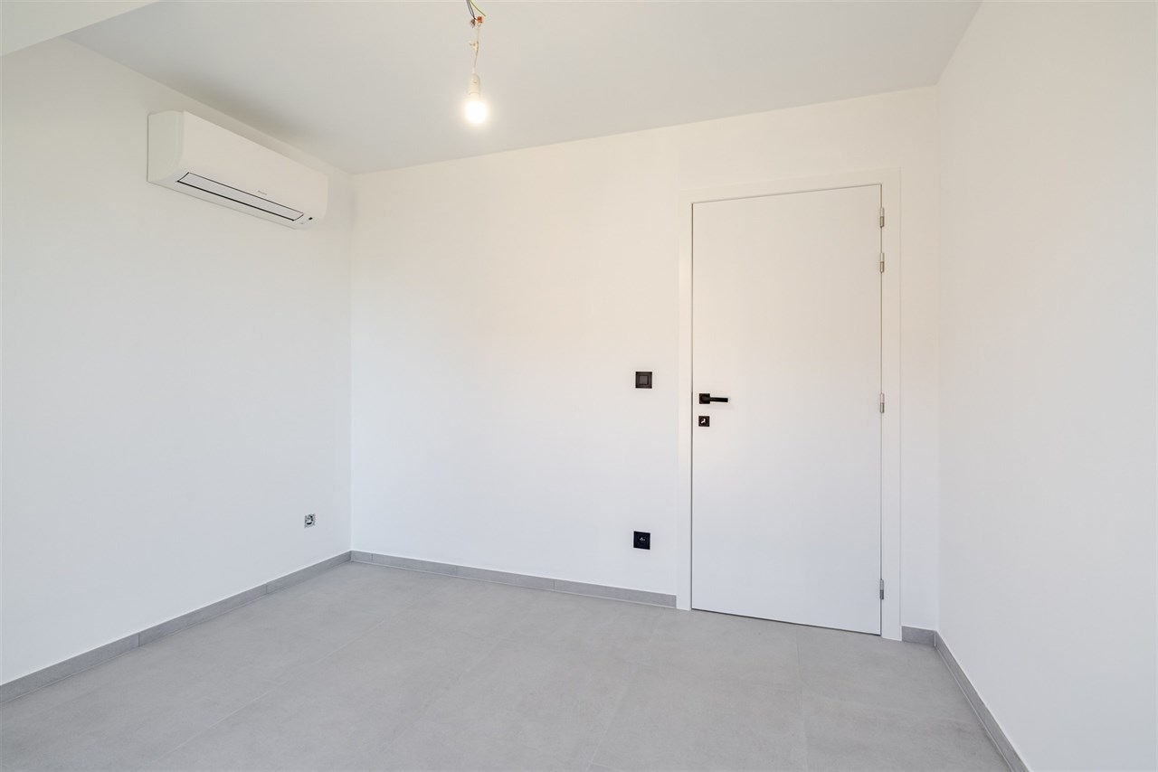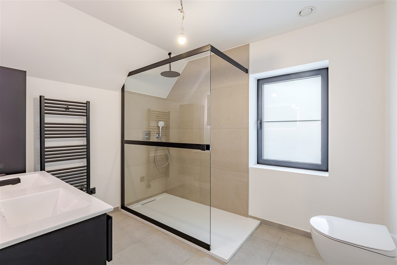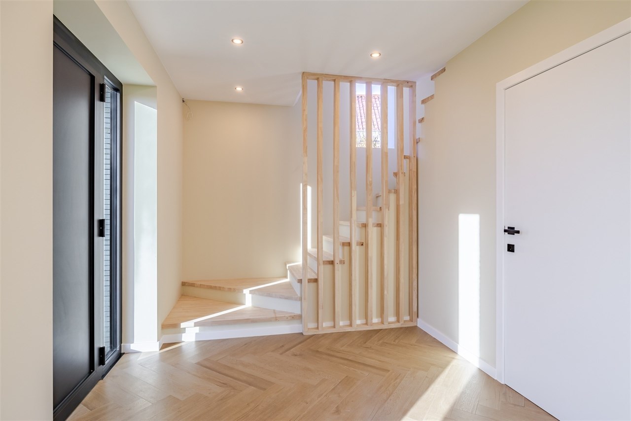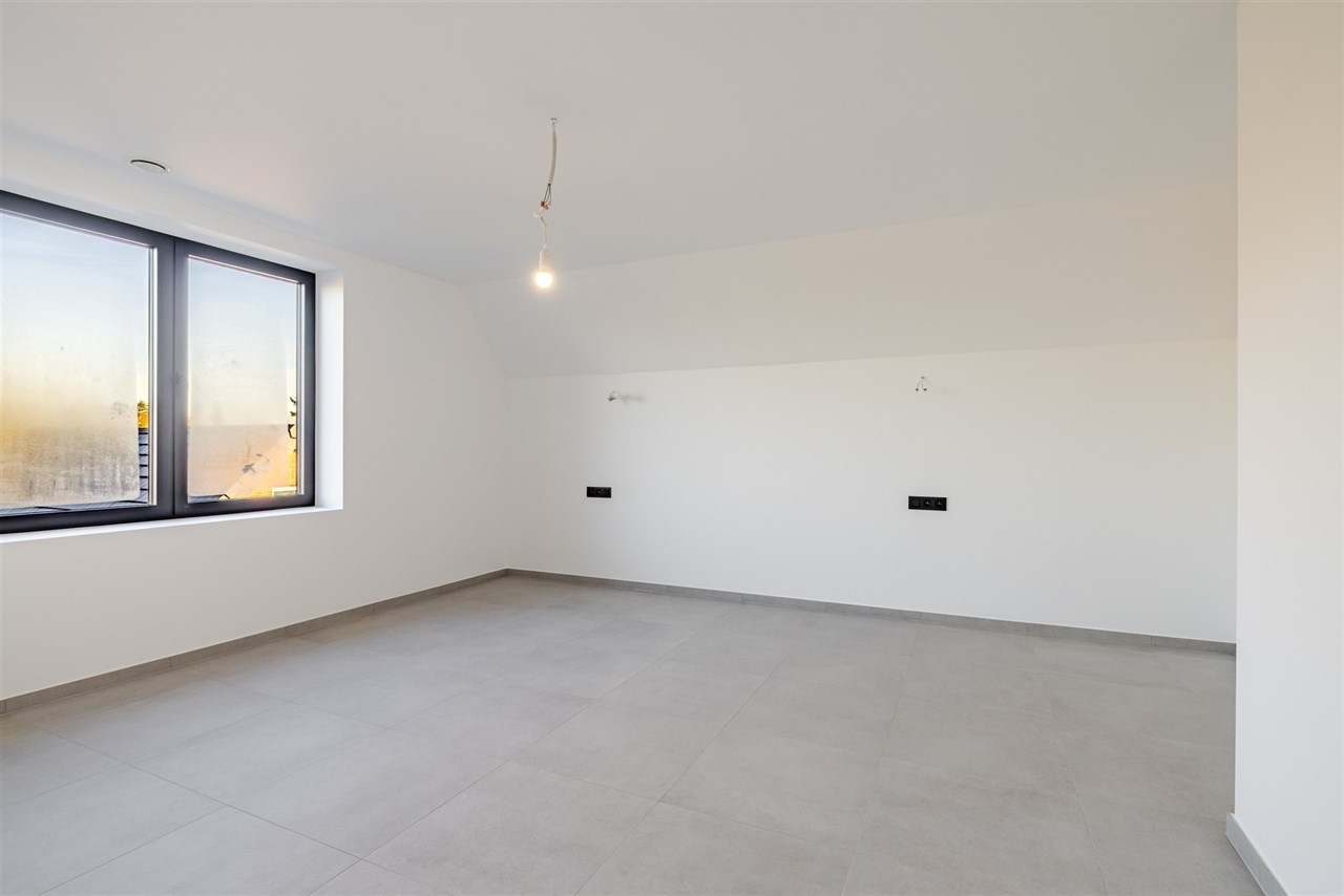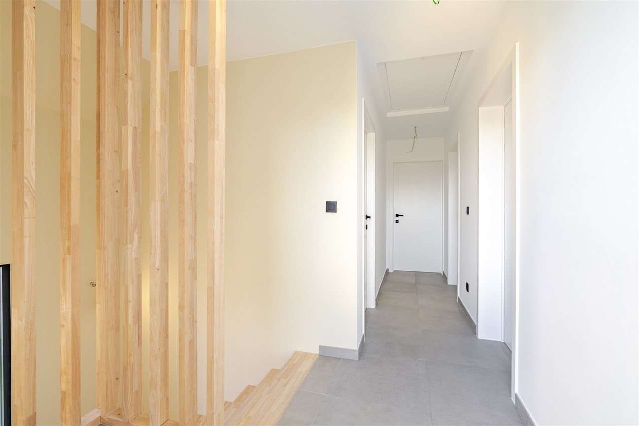 De indeling is als volgt: een ruime inkomhal met gastentoilet leidt naar een bijzonder lichtrijke leef- en eetruimte. Dankzij het open karakter van de woning baadt ook de keuken (nog vrij te plaatsen) in natuurlijk licht. Op de verdieping bevinden zich drie volwaardige slaapkamers, een stijlvolle badkamer met inloopdouche, toilet en lavabomeubel, evenals een praktische was- en bergruimte. Extra opbergruimte is voorzien via een kelder en zolder.