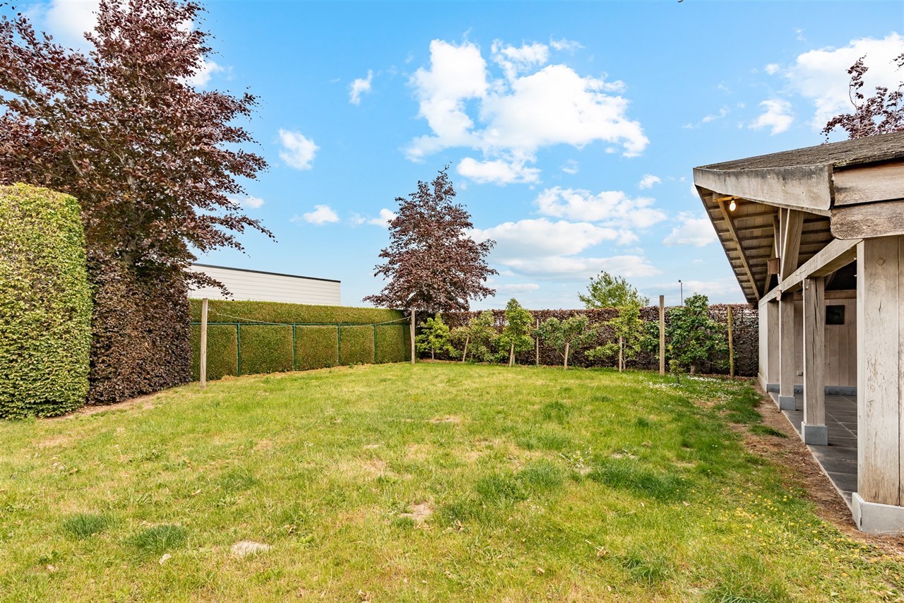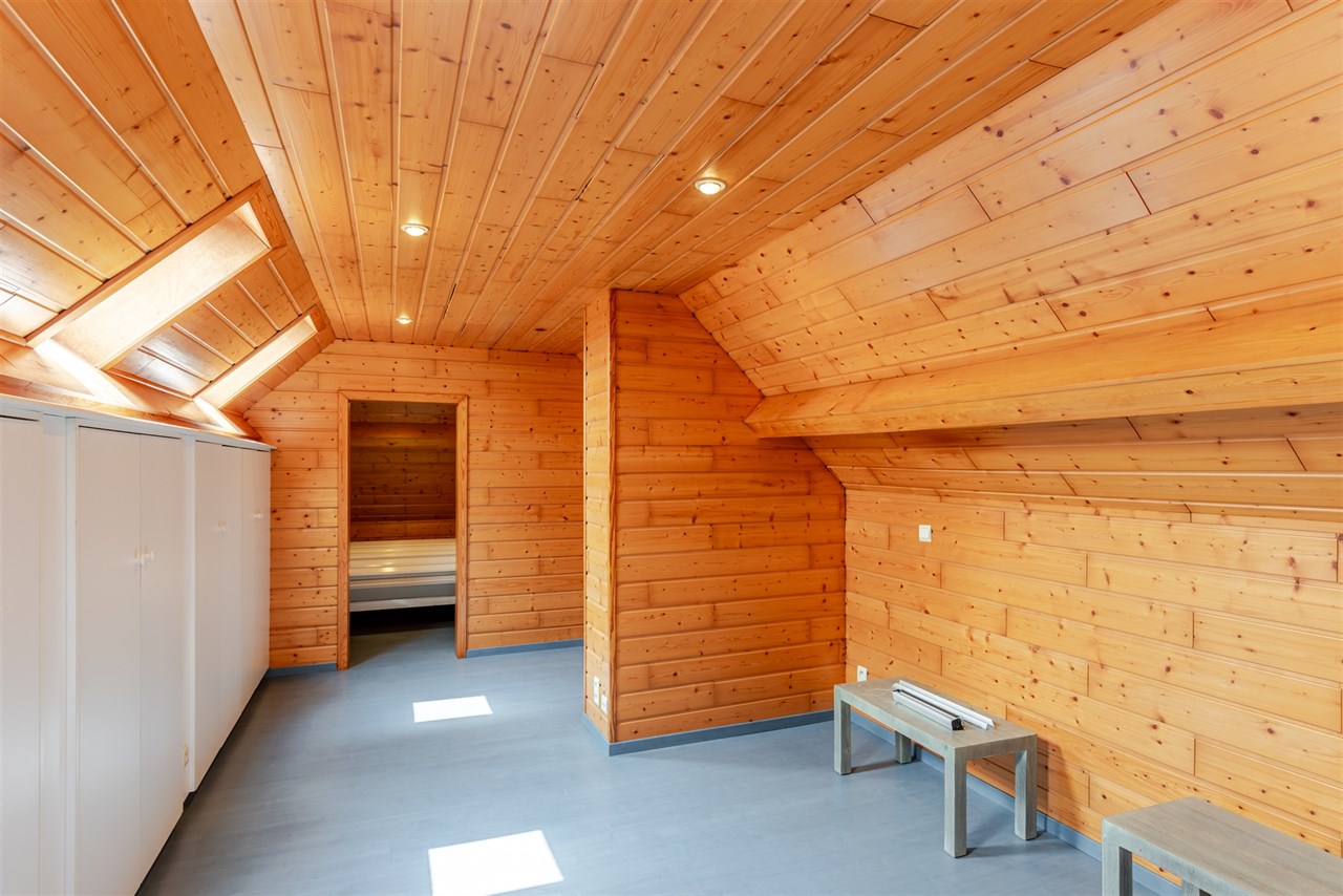 Buiten vinden we een zeer ruime garage (75m²) met een dubbele elektrische poort. Aansluitend is een gezellig overdekt terras met houtkachel, sauna en buitendouche. Tot slot beschikt deze woning ook nog over een zeer ruime kelder van 52m².
